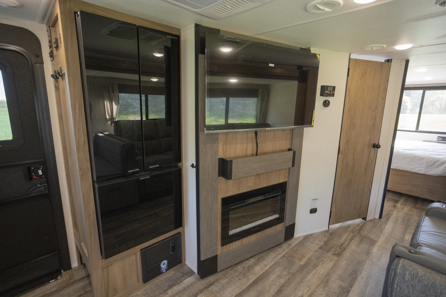 The Campsite Ultra 26BW a front kitchen floorplan that will thrill the cook among your crew with the natural light alone. Yes, those rear windows keep everything open and bright, and the hidden pantry behind the entertainment center reaffirms the fact that this front kitchen has everything your camp chef needs to store goods and prep delicious camping meals.