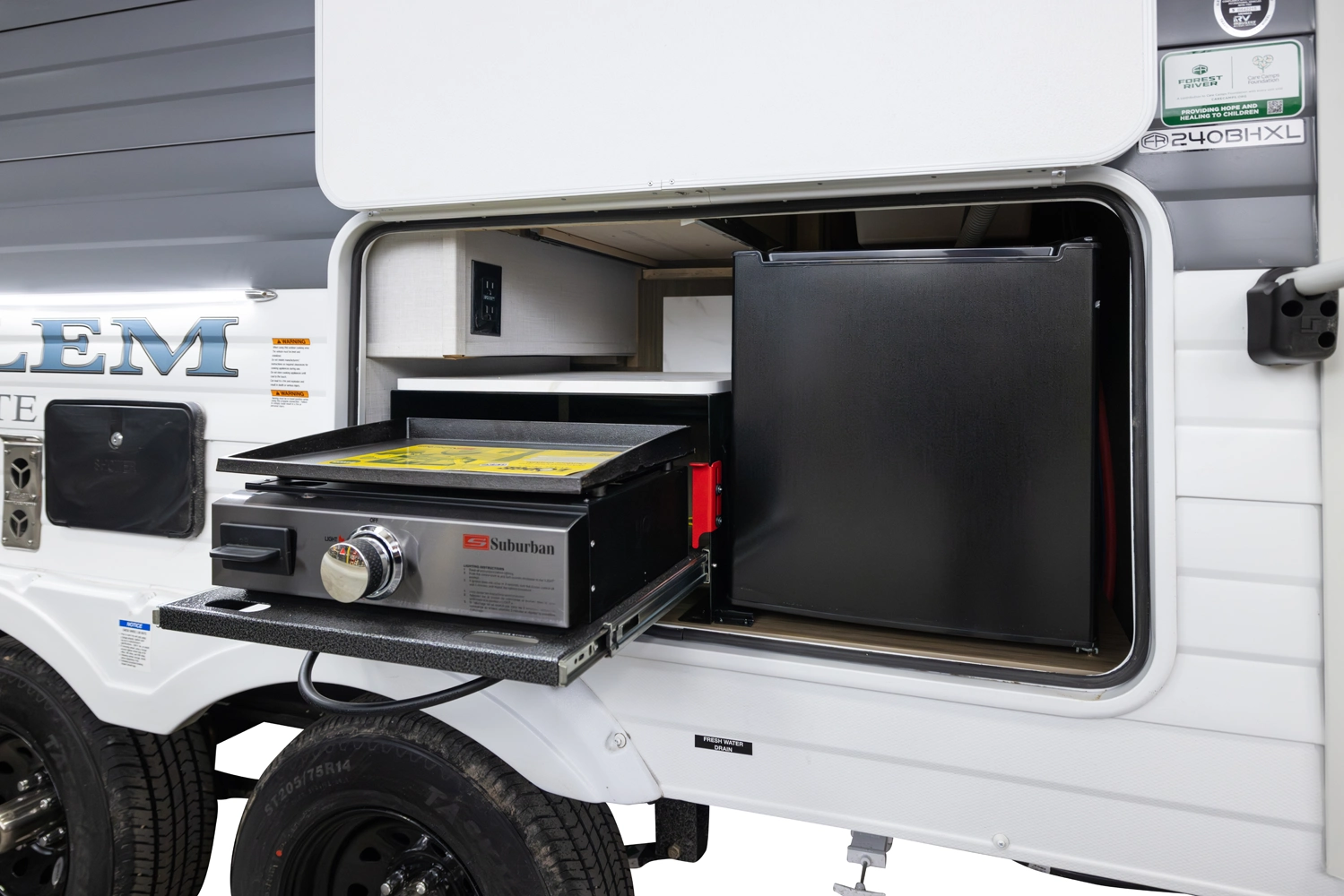 The 240BHXL weighs in at less than 6,000 lbs. for increased towability, without sacrificing any of the comfort! This double-over-double bunkhouse packs a lot of features into its 28'10” length, including a large comfy booth dinette with panoramic windows, walk-in pantry, modern kitchen with stove, cooktop, microwave, and an oversized refrigerator! The bathroom provides a walk-in shower with skylight and a convenient second door to the outside.