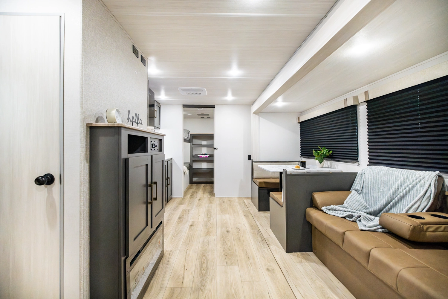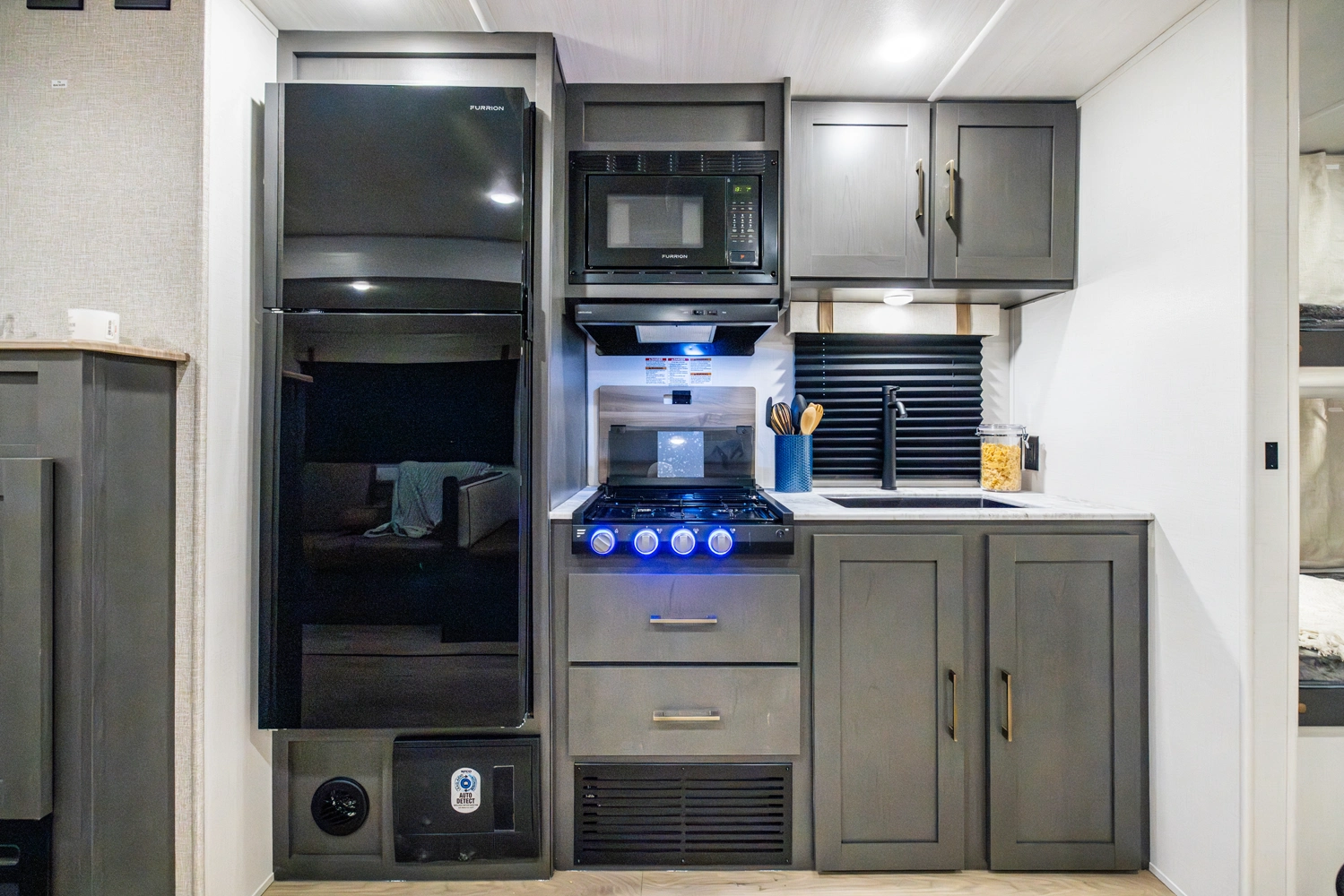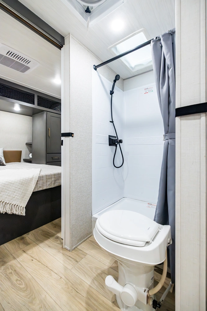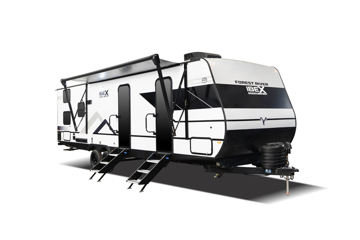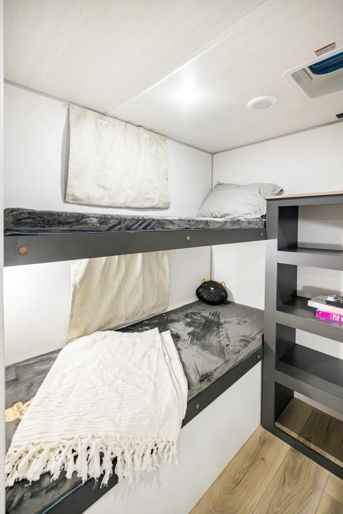 The Ibex New Trail Edition TRAIL28 features a front queen bed, central living area with sofa and dinette, a full kitchen, and a walk-through bath. A private rear bunk room offers four bunks and extra storage. Includes washer/dryer prep, tankless water heater, 50-amp service, and designed with superior construction.