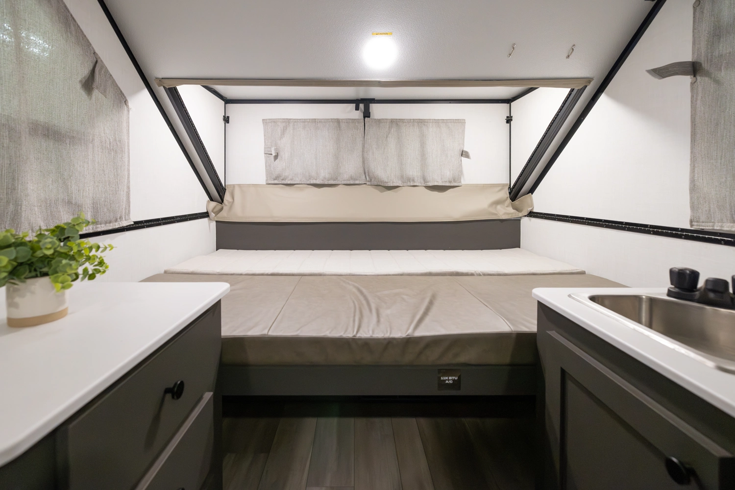 The Rockwood A121FD is a thoughtfully designed A-frame camper that maximizes space. It features a front 45" x 80" dinette, perfect for dining and relaxing. In the living area, you'll find a sink, cooktop, and small refrigerator. At the rear, a spacious 54" x 80" gaucho bed awaits, and with a double dormer, you get increased head height on both sides for extra comfort.